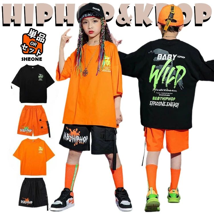 オレンジ キッズ ダンス衣装 セットアップ 夏 練習着 男の子 女の子 かっこいい おしゃれ ワンポイント 半袖 シャツ ゆったり カジュアルシャツ トップス 黒 短パンダンス ジャズダン