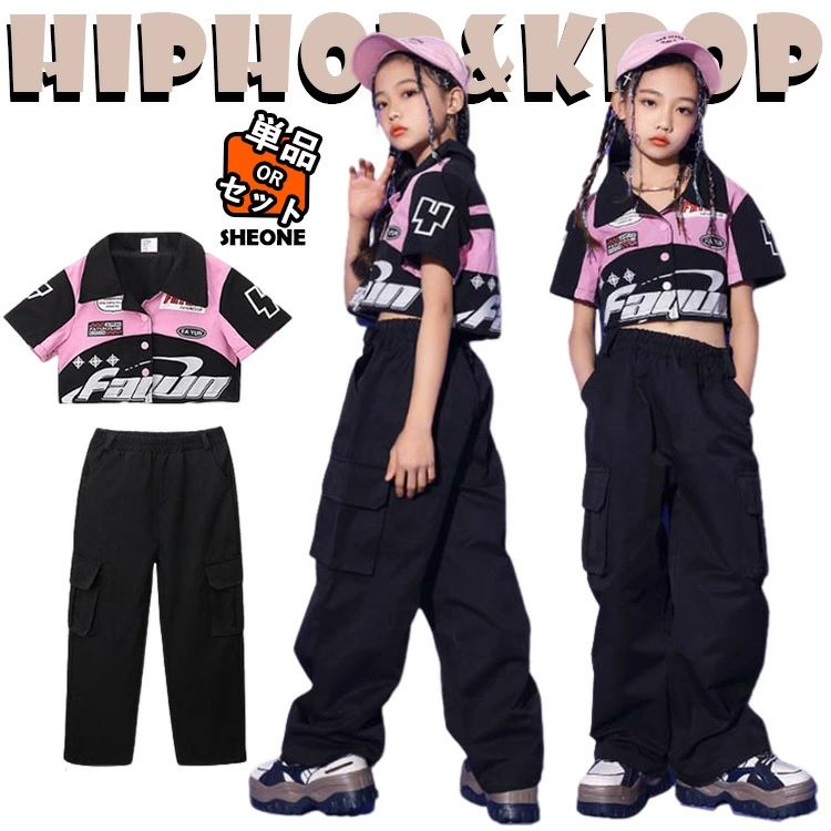 ピンク ヒップホップ 派手 キッズ ダンス 衣装 発表会 ショート トップス へそ出し パンツ ヒップホップ 韓国 ダンス衣装 セットアップ 半袖tシャツ カーゴパンツ ゆったり ストリ