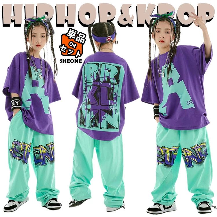 パープル グリーン キッズ ダンス 衣装 発表会 レトロ サルエルパンツ ヒップホップ 韓国 ダンス衣装 セットアップ 半袖 tシャツ トップス ロング パンツ ゆったり ストリート オ