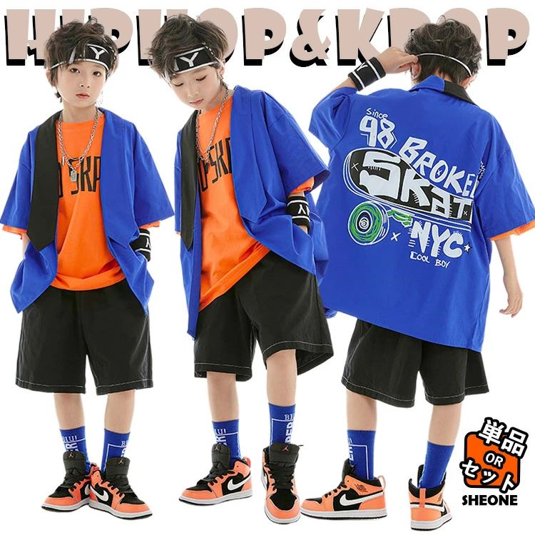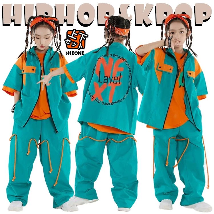 黒 青 紺 オレンジ キッズ ダンス 衣装 発表会 レトロ サルエルパンツ ヒップホップ 韓国 ダンス衣装 セットアップ 半袖 tシャツ トップス ショート カーゴパンツ ゆったり オシ