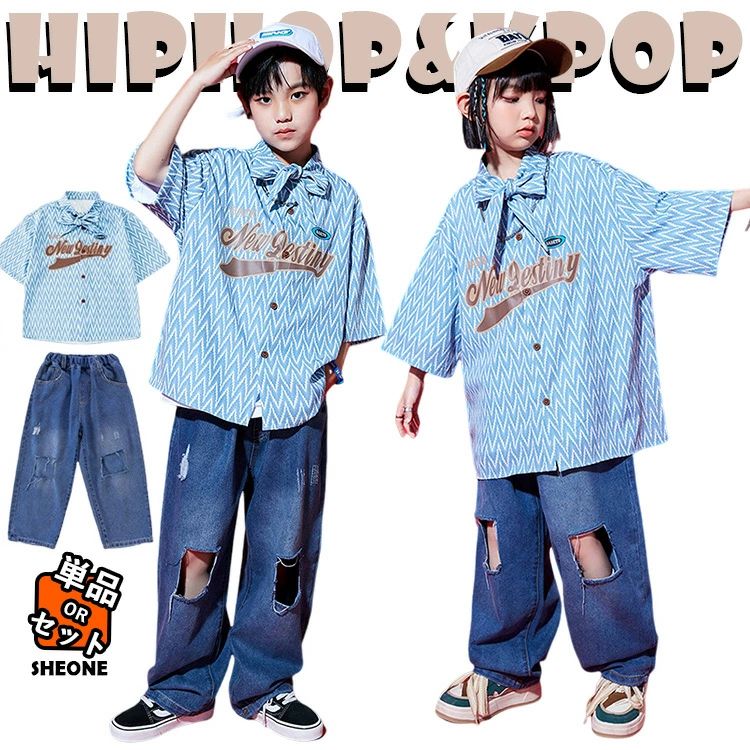 デニムパンツ 青 半袖 夏 キッズ ダンス衣装 トップス パンツ セットアップ デニム 男の子 女の子 かっこいい カジュアル シャツ カジュアルシャツ ダンスウェア ヒップホップ ジャ