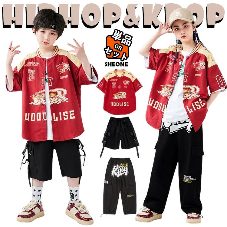 キッズ ダンス衣装 セットアップ 赤 ベースボールシャツ 半袖シャツ 女の子 男の子 ゆったり おしゃれ カジュアルシャツ トップス 黒 短パン ロンパン ヒップホップ ジャズダンス 韓