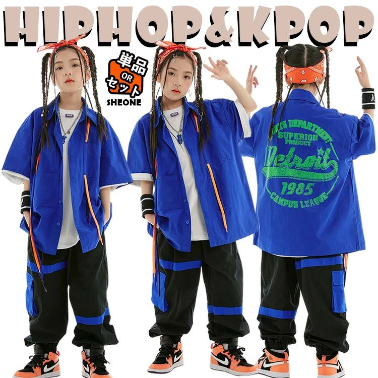 ブルー キッズ ダンス衣装 セットアップ OVERSIZE 女の子 男の子 おしゃれ ゆったり トップス かっこいい カジュアルシャツ 緑 柄シャツ 黒 ブルー ロングパンツ ダンスパンツ ヒップ