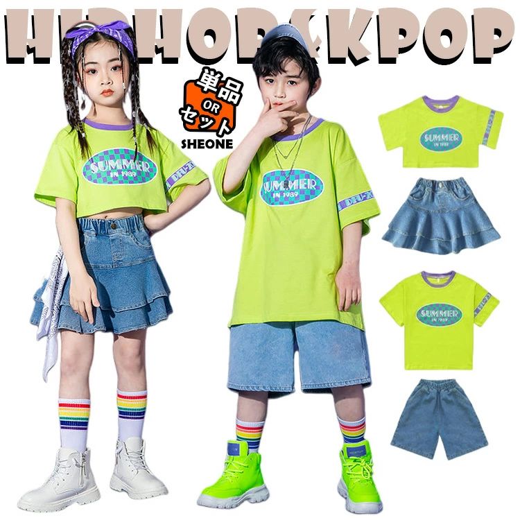 キッズ ダンス衣装 セットアップ チア チアガール 韓国 k-pop 発表会 演出服 団体服 応援団 女の子 男の子 緑 ショートトップス へそ出し 半袖シャツ トップス ワンポイント デニム