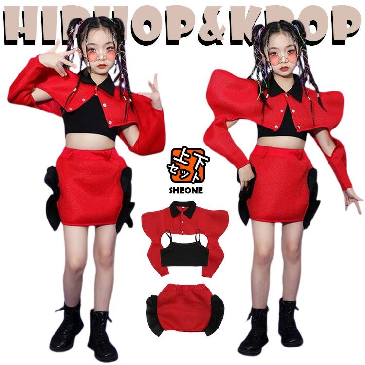 紅色 黒 半袖 夏 キッズ ダンス衣装 韓国 トップス パンツ セットアップ デニムパンツ デニム 男の子 女の子 かっこいい カジュアル シャツ カジュアルシャツ ダンスウェア ヒップ