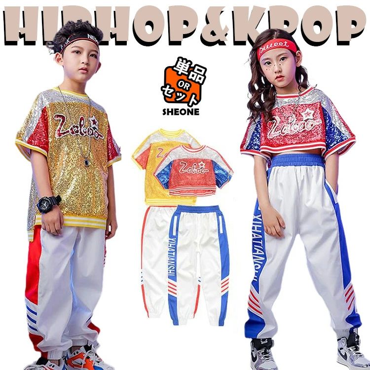 赤 黄 半袖 夏 キッズ ダンス衣装 hiphop 韓国 トップス パンツ セットアップ デニムパンツ デニム 男の子 女の子 かっこいい カジュアル tシャツ カジュアルTシャツ ダンスウェア