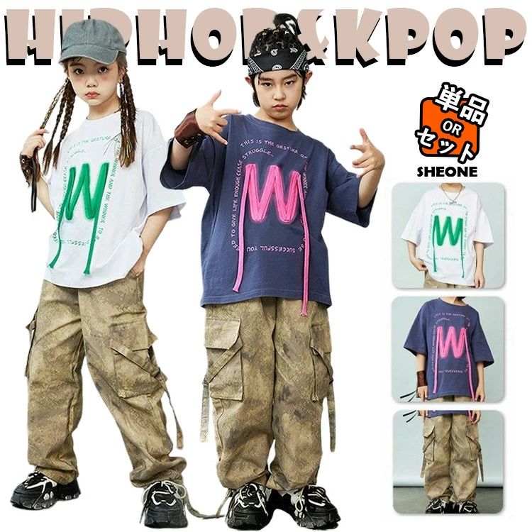 キッズ ダンス衣装 セットアップ 男の子 女の子 tシャツ 半袖 白 パープル ゆったり カジュアルシャツ トップス 緑 ピンク ワンポイント 迷彩パンツ カーゴパンツ ヒップホップ ジャ