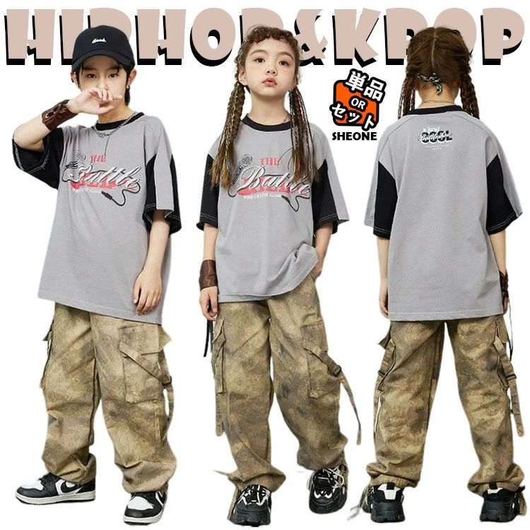 おしゃれ キッズ ダンス衣装 セットトップ 男の子 女の子 かっこいい グレー ゆったり 半袖 シャツ トップス 迷彩 パンツ 黒 カーゴパンツ ダンスパンツ ヒップホップ ジャズダンス