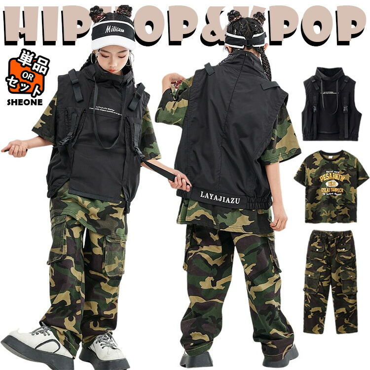 迷彩 黒ベスト かっこいい キッズ ダンス衣装 セットトップ 男の子 女の子 迷彩 黒迷彩 タイダイ柄 ゆったり カジュアルシャツ トップス 迷彩 カーキ カーゴパンツパンツ ダンスパン