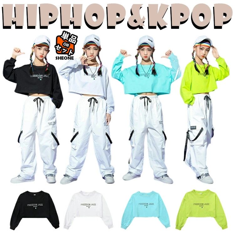 4色 キッズ ダンス 衣装 長袖 おしゃれ かっこいい かわいい 女の子 セットアップ ゆったり 青 緑 白 黒 トップス パンツ ジャズダンス ヒップホップ 派手 韓国 kpop ポッピング ロッ