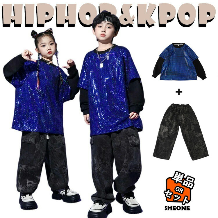 青 キッズ ダンス 衣装 スパンコール おしゃれ かっこいい かわいい 女の子 男の子 セットアップ ゆったり トップス パンツ ジャズダンス ヒップホップ 派手 韓国 タータンチェ