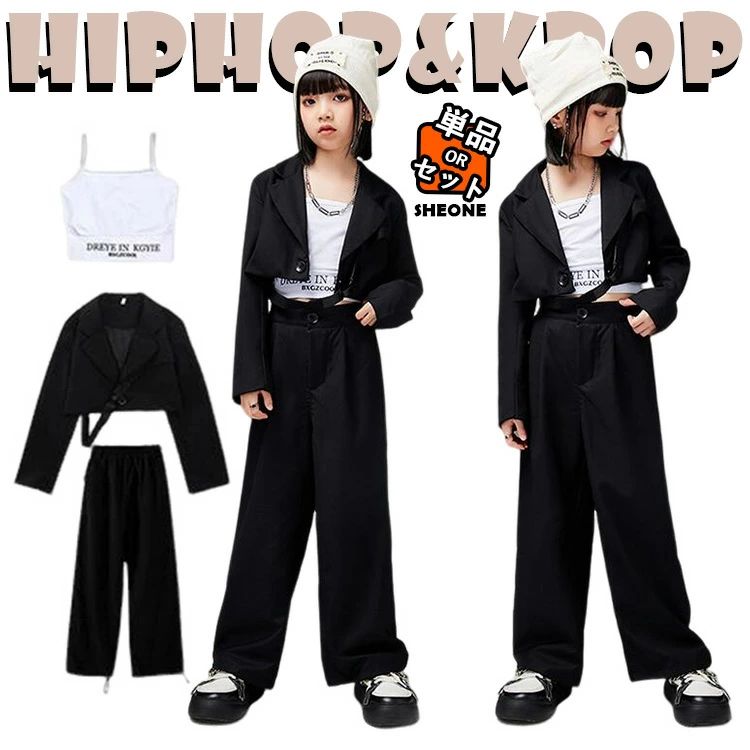 ブラック キッズ ダンス衣装 セットアップ 女の子 男の子 スーツセット パンツ トップス へそ出しカジュアル 子供 ストリート ダンスウェア ヒップホップ ジャズダンス ポッピング 演