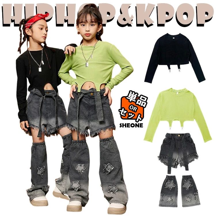 緑 黒 デニム パンツキッズ ダンス衣装 キッズダンス セットアップ 女の子トップス 長袖 ショーパン あしかっぱ 子供 ストリート ダンスウェア ヒップホップ ジャズダンス ポッピ 演