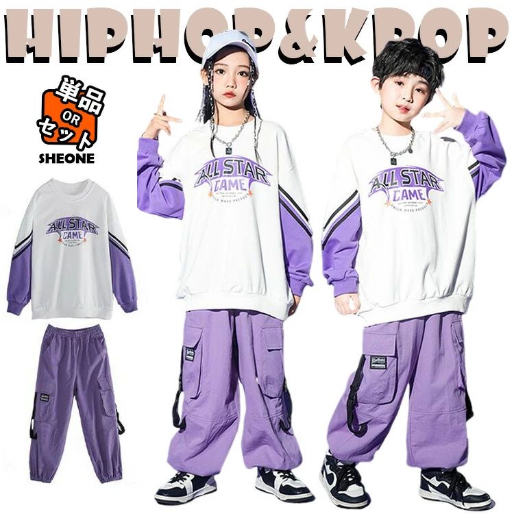 パープル キッズ ダンス衣装 セットアップ 男の子 女の子トップス 長袖 カーゴパンツ 子供 ストリート ダンスウェア ヒップホップ ジャズダンス ポッピング 演出服 舞台服 練習着 団