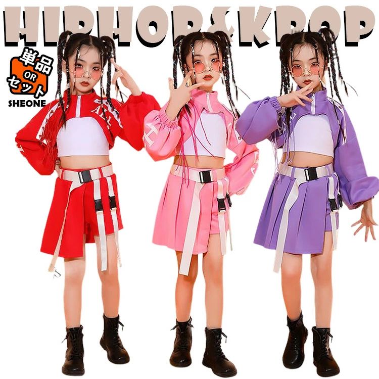 レッド ピンク 紫 キッズ ダンス衣装 セットアップ ロック ロッキング 女の子トップス 長袖 へそ出し スカート 子供 ストリート ダンスウェア ヒップホップ ジャズダンス ポッピング