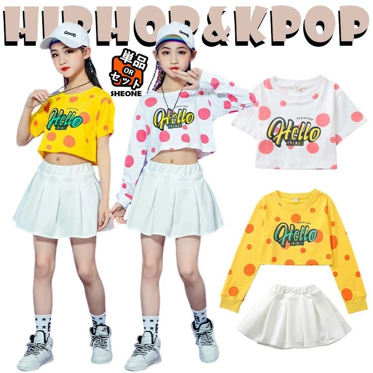 イエロー ホワイト キッズ ダンス衣装 キッズダンス セットアップ 女の子 パンツ 半袖 長袖 トップス スカート スカートセット へそ出し カジュアル 子供 ストリート ダンスウェア ヒ