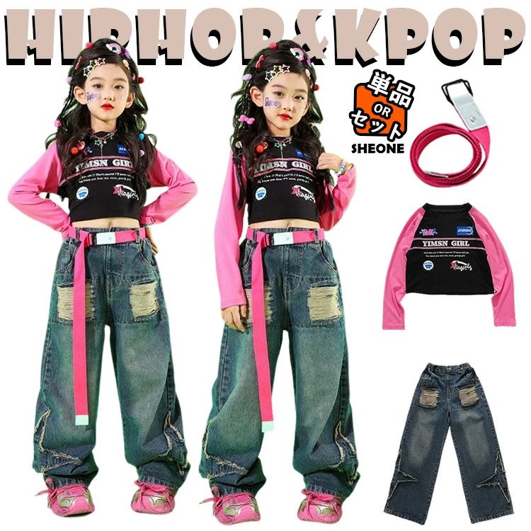 キッズ ダンス 衣装 セットアップ かわいい おしゃれ かっこいい 女の子 ガールズ ゆったり トップス パンツ ベルトブラック グレー デニムパンツ ジャズダンス ヒップホップ 派手 韓