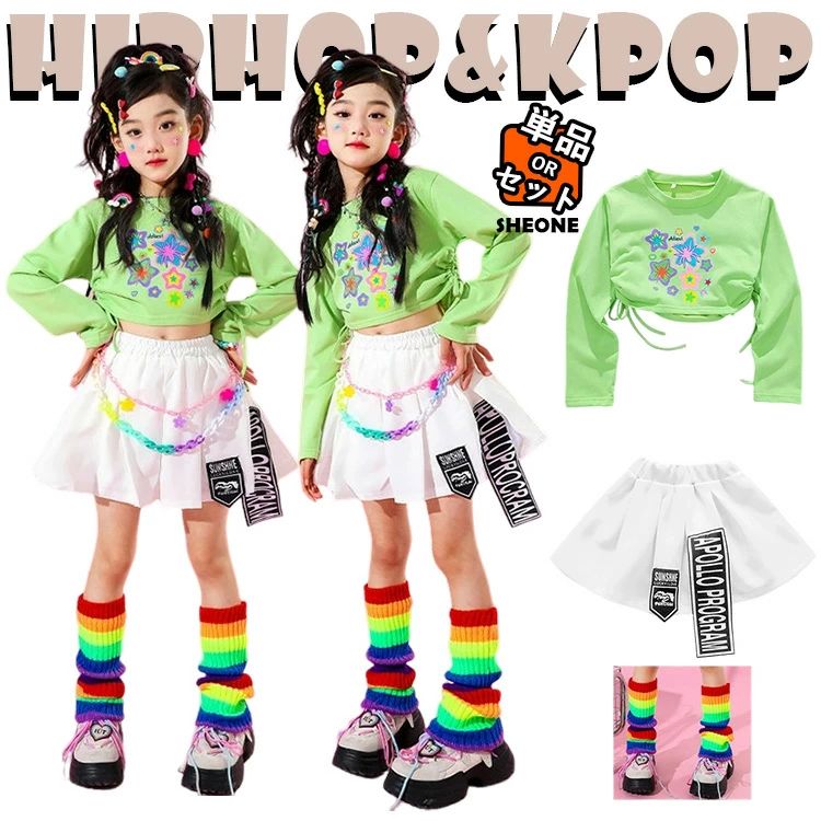 キッズ ダンス 衣装 セットアップ かわいい おしゃれ かっこいい 女の子 ガールズ ゆったり トップス スカート 脚カバー ベルト グリーン ホワイト ジャズダンス ヒップホップ 派手