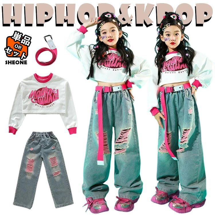 キッズ ダンス 衣装 セットアップ かわいい おしゃれ かっこいい 女の子 ガールズ ゆったり トップス パンツ ベルト ホワイト グレー デニムパンツ ジャズダンス ヒップホップ 派手