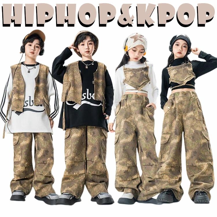 カーキグリーン 黒 白 キッズ ダンス衣装 セットアップ 迷彩ベスト 迷彩キャミソール 迷彩パンツ 長袖セット 迷彩セット ヒップホップ キッズ ダンス衣装 男の子 女の子 韓国 発表会