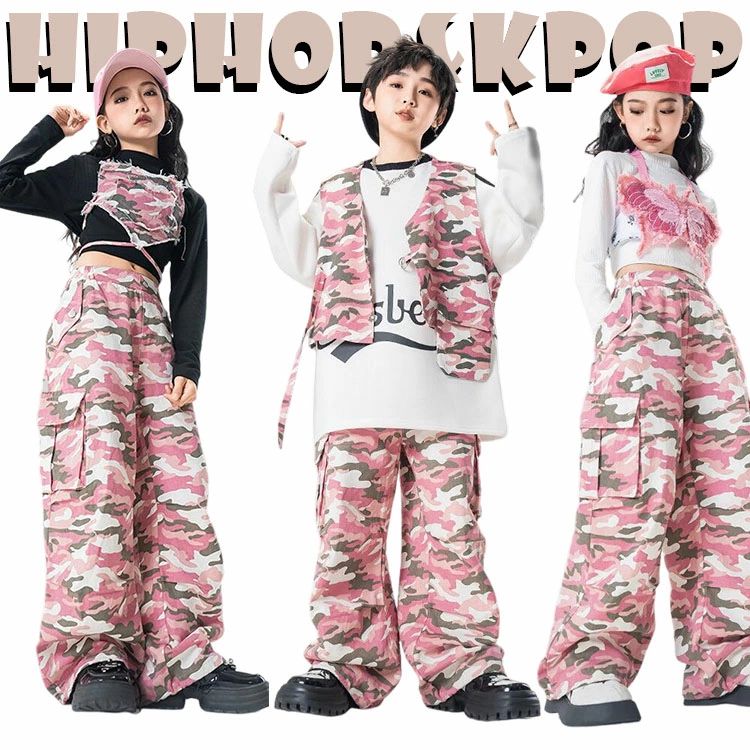 迷彩 ピンク 黒ダンス衣装 迷彩セット キッズ キッズダンス セットアップ 迷彩ベスト 迷彩蝶キャミソール 迷彩パンツ 長袖 ヒップホップ キッズ ダンス衣装 男の子 女の子 韓国-