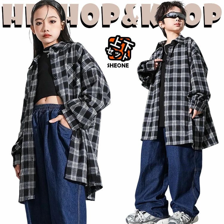 ブラック キッズ ダンス衣装 セットアップ チェックトップス チェック長袖 パンツ 女の子 男の子 子供 ストリート ダンスウェア ヒップホップ ジャズダンス ポッピング 演出服 舞台服