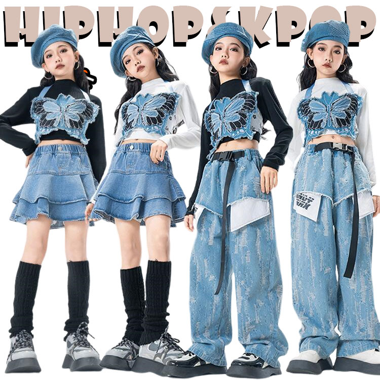 ブルー 白 黒 キッズ キッズダンス セットアップ デニムベスト デニム蝶キャミソール デニムパンツ 長袖 ヒップホップ キッズ ダンス衣装 女の子 韓国- 演出服 舞台服 発表会