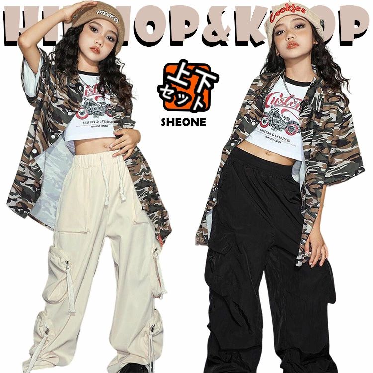 迷彩シャツ キッズ ダンス衣装 セットアップ 迷彩セット 女の子 カジュアルシャツ パッチワーク トップス 撮影用 かっこいい おしゃれ ジャケット 黒 迷彩 パンツ サルエルパンツ ジ