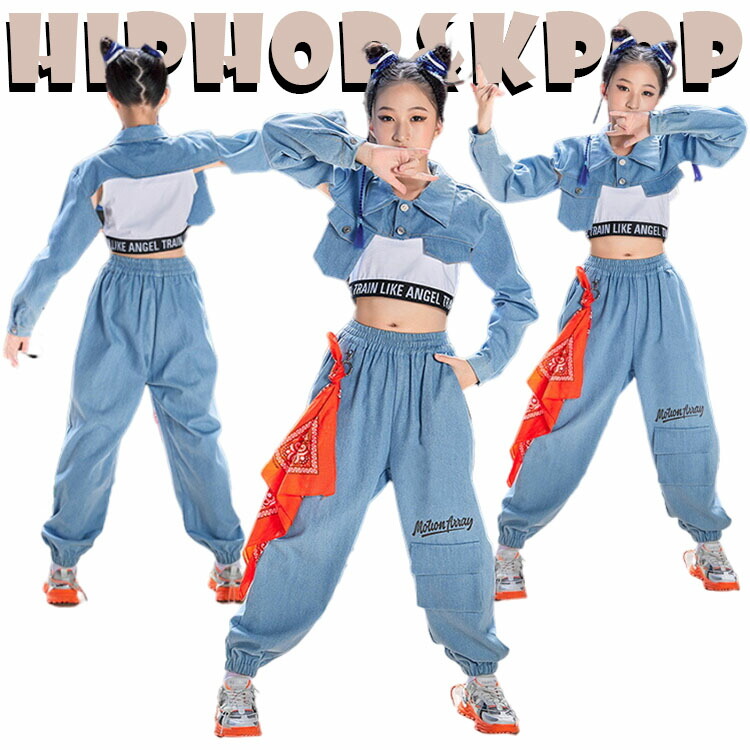 受注生産 女の子 デニム 韓国 キッズ ダンス 衣装 セットアップ ヒップホップ ショート キャミソール トップス へそ出し ベスト ロング デニムパンツ 練習着 演出服