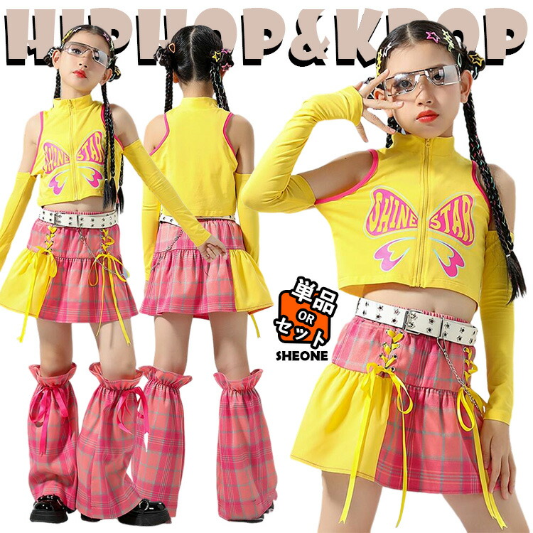 チェックセット 肩だし イエロー キッズ ダンス 衣装 セットアップ ジャズ へそ出し 女の子トップス スカート ベルト 足カバー 柄シャツ 蝶柄 ポッピング ロッキング ジャズダンス ヒ