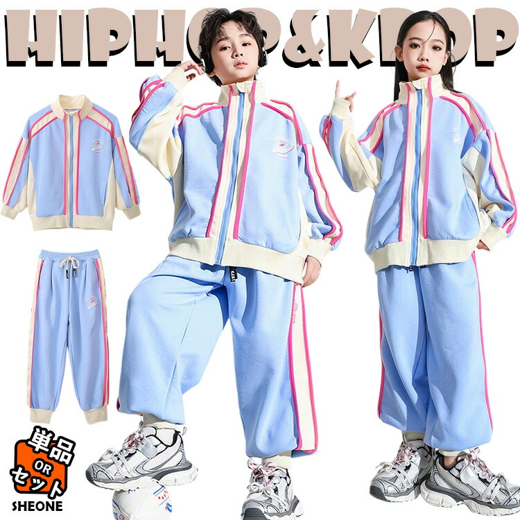 白 青 キッズ ダンス衣装 セットアップ キッズ 女の子 男の子 カジュアルシャツ ベースボール パーカートップス パンツ 柄シャツ スウェットパンツ 白 ブルー ダンス パンツ サルエル