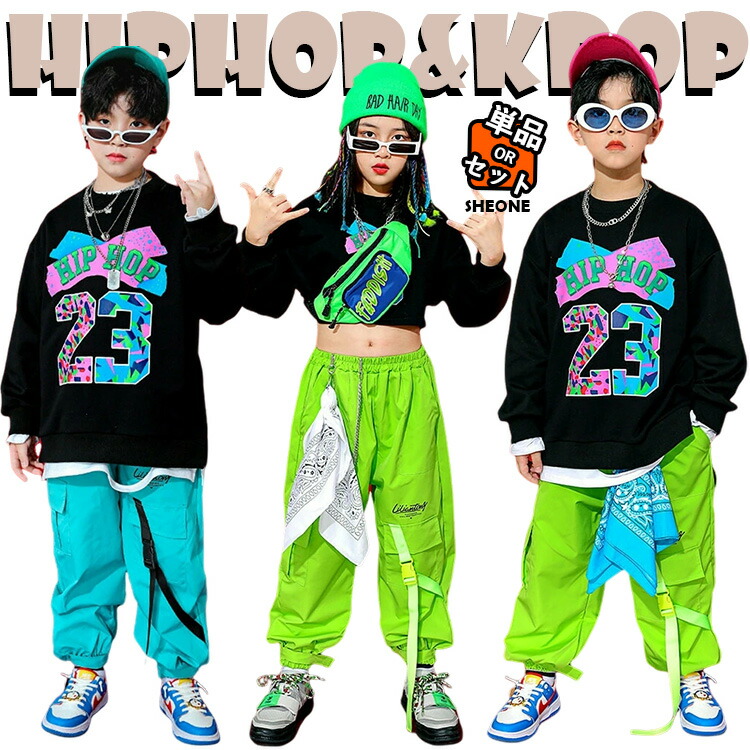 キッズ ダンス 衣装 セットアップ かわいい おしゃれ かっこいい 男の子 女の子 ガールズ ゆったり トップス トレーナー インナー パンツ 緑 青 紫 ジャズダンス ヒップホップ 派手